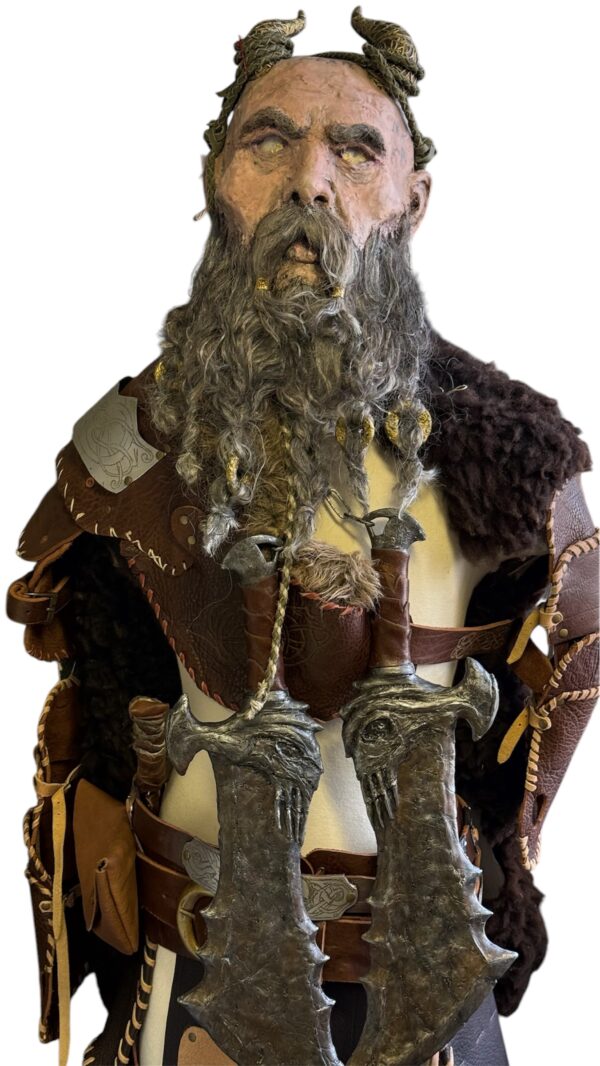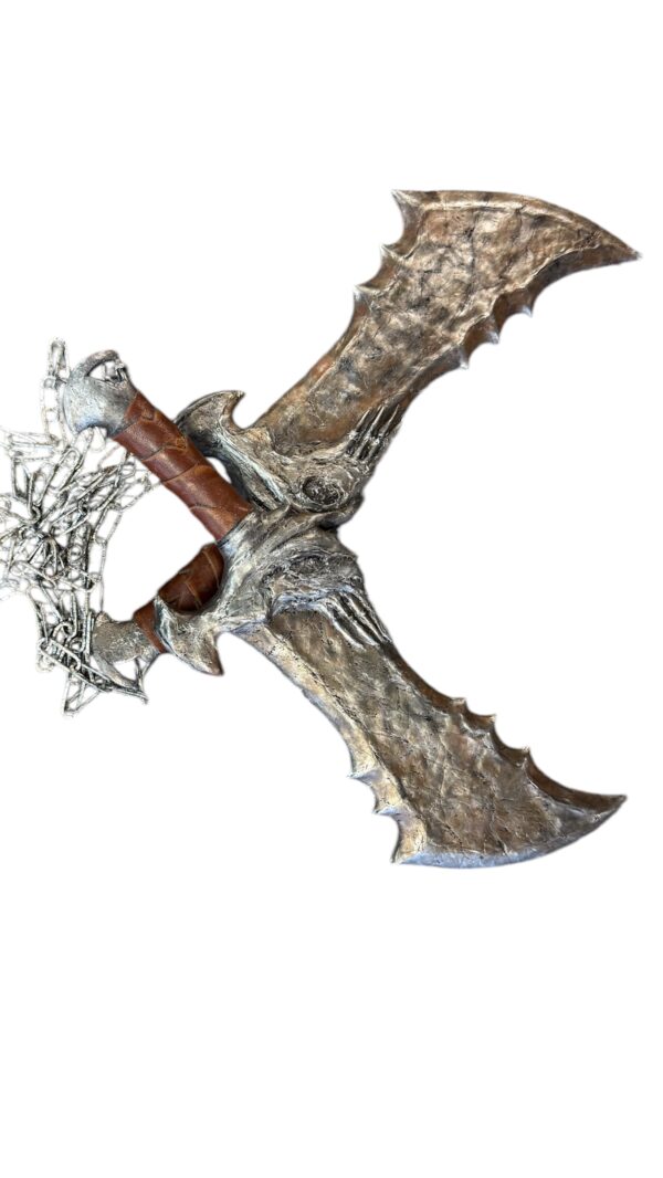 Bij dit kostuum zitten onderdelen van: Een pratend hoofd van Mimir, Leviathan Axe met licht effect en the blades of chaos.